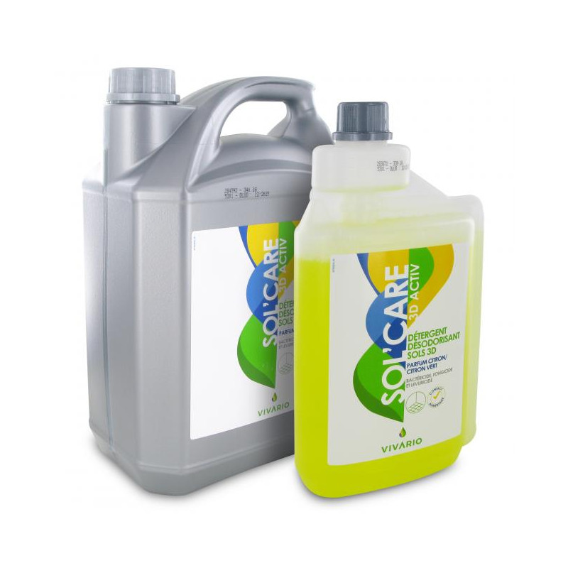 SOL’CARE 3D ACTIV est un Détergent neutre alimentaire parfumé bactéricide, fongicide, lévuricide et virucide pour l’entretien des sols et revêtements résistants à l’eau. Parfum ambiance ou citron.